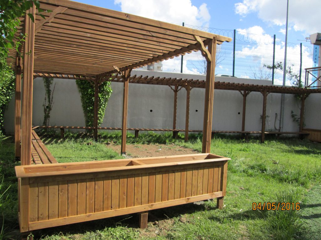 Projenin göz alıcı unsurlarından biri olan ahşap saksılı pergoleler, bitkilerle bütünleşerek peyzaja hareket kattı. Bu özel tasarım pergoleler, hem gölgelik işlevi görerek güneşli günlerde serin bir dinlenme alanı sundu hem de ahşabın doğal dokusu ve saksılardaki yeşil bitkilerle ortama doğallık kattı. Sakinler, pergolelerin altında hem dinlenme hem de sosyalleşme imkânı buldu.