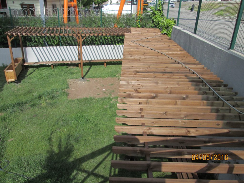 Projenin göz alıcı unsurlarından biri olan ahşap saksılı pergoleler, bitkilerle bütünleşerek peyzaja hareket kattı. Bu özel tasarım pergoleler, hem gölgelik işlevi görerek güneşli günlerde serin bir dinlenme alanı sundu hem de ahşabın doğal dokusu ve saksılardaki yeşil bitkilerle ortama doğallık kattı. Sakinler, pergolelerin altında hem dinlenme hem de sosyalleşme imkânı buldu.